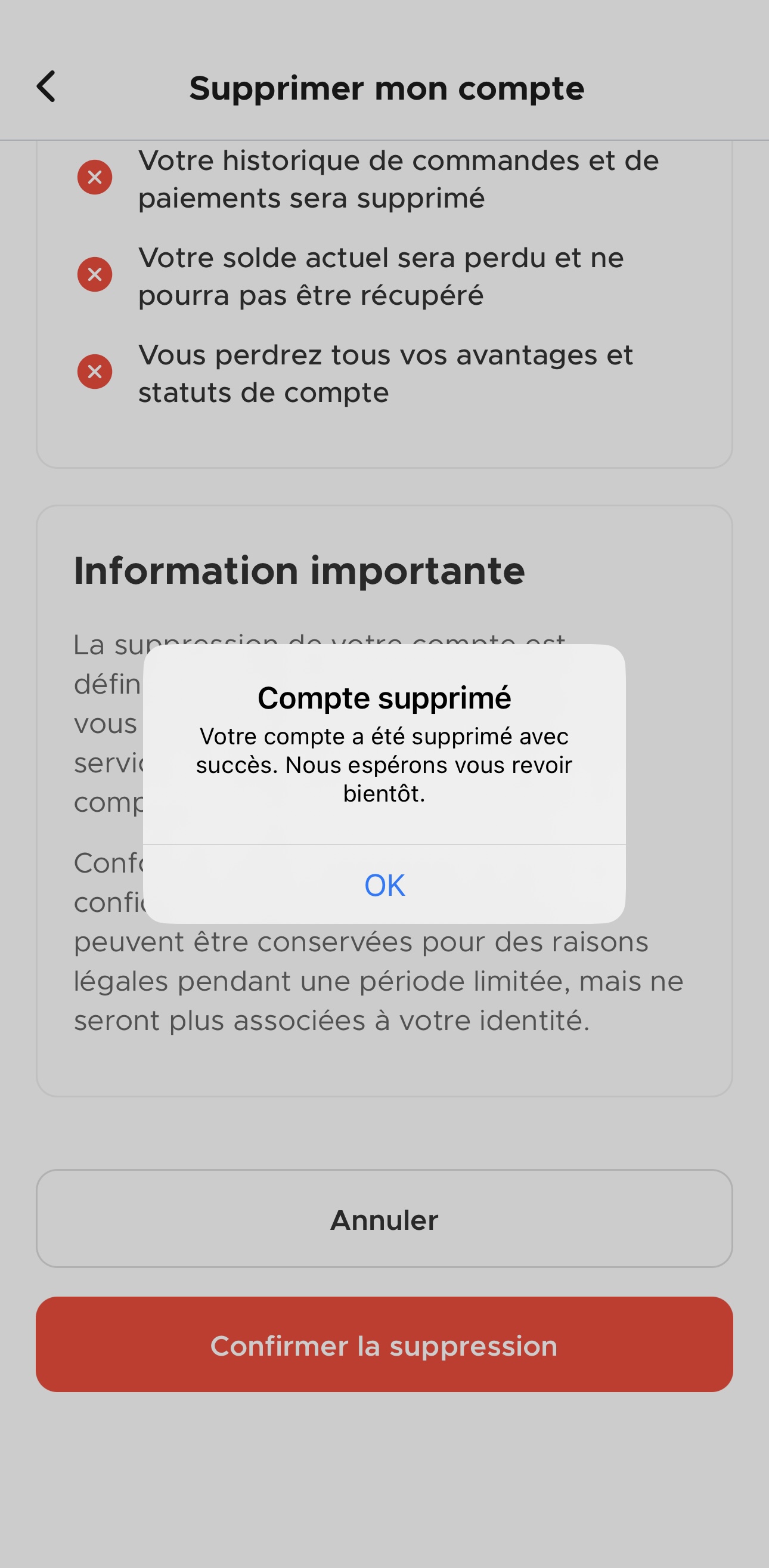 Bouton de suppression : Veuillez cliquer sur le bouton rouge situé en bas de l'écran afin de confirmer la suppression de vos données sur la plateforme Kabod. Une fois que la suppression a été éffectuée avec succès un message de confirmation vous sera affiché. Veuillez vous référer aux images présentées ci-dessous :