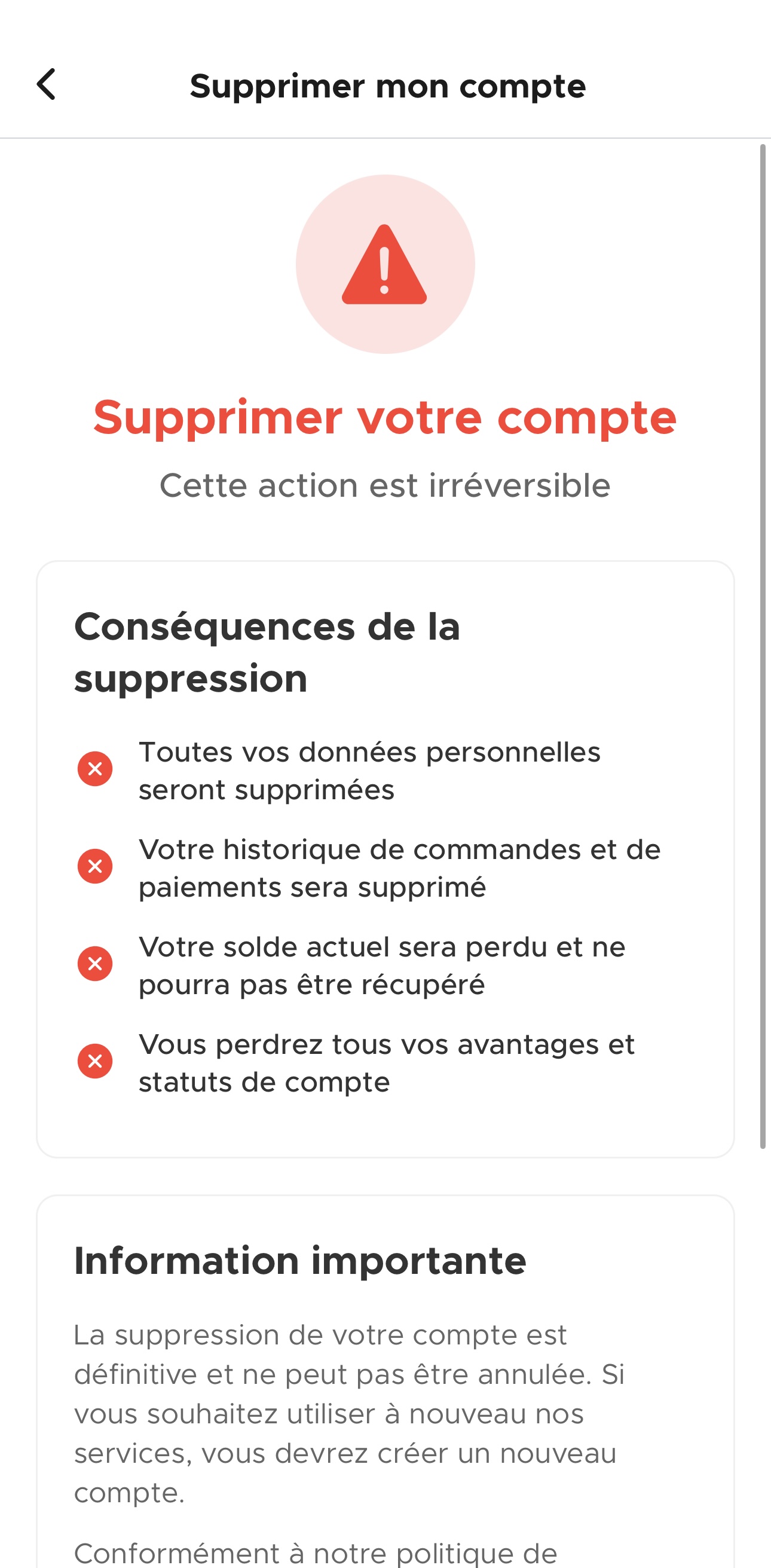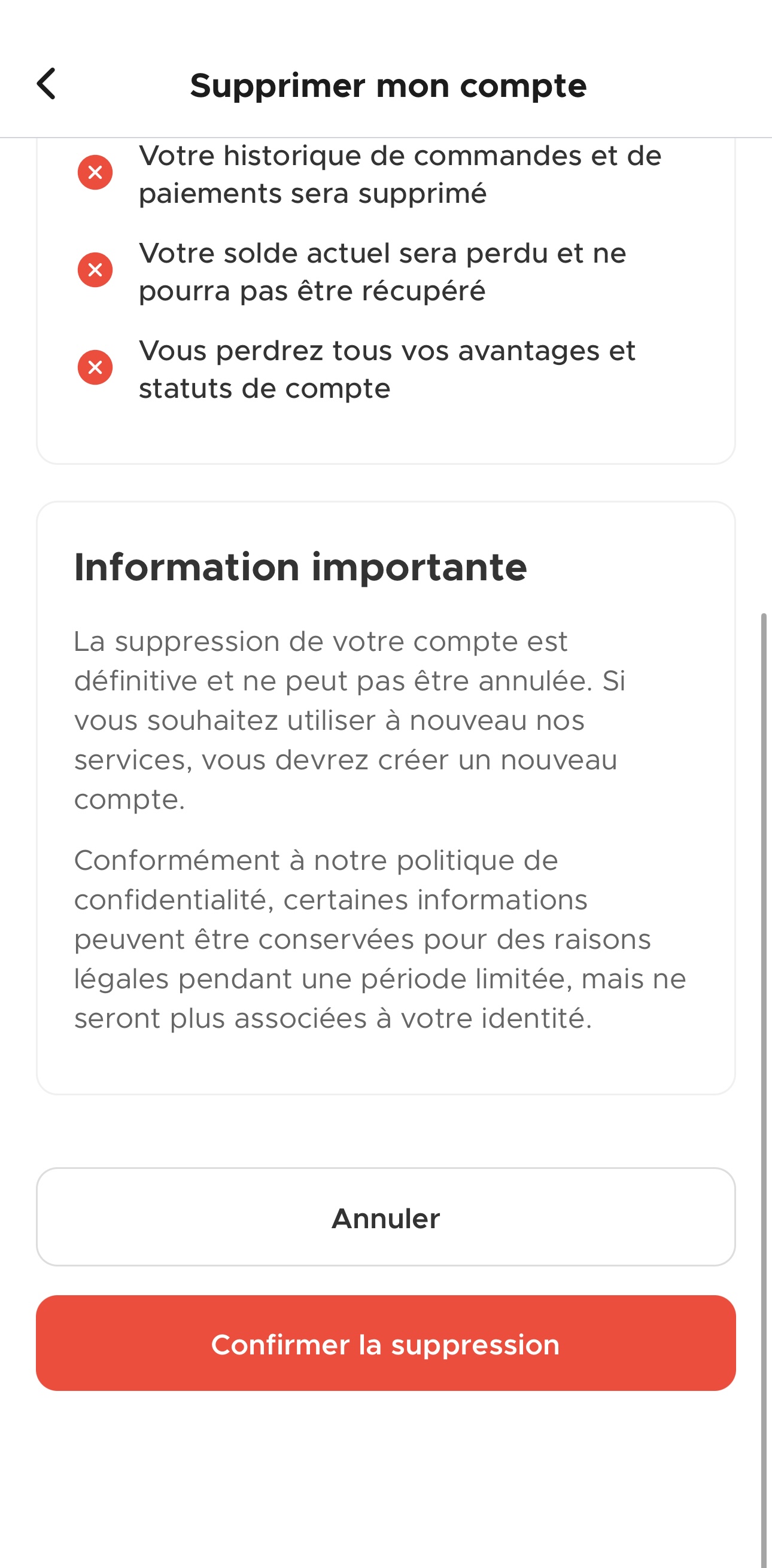 Delete: Localisez ensuite sur la page courante le texte Supprimer mon compte vers le bas de l'ecran. Une page vous explicquant les consequences de cette action vous sont presenter. Referez-vous à l'image ci-dessous:
