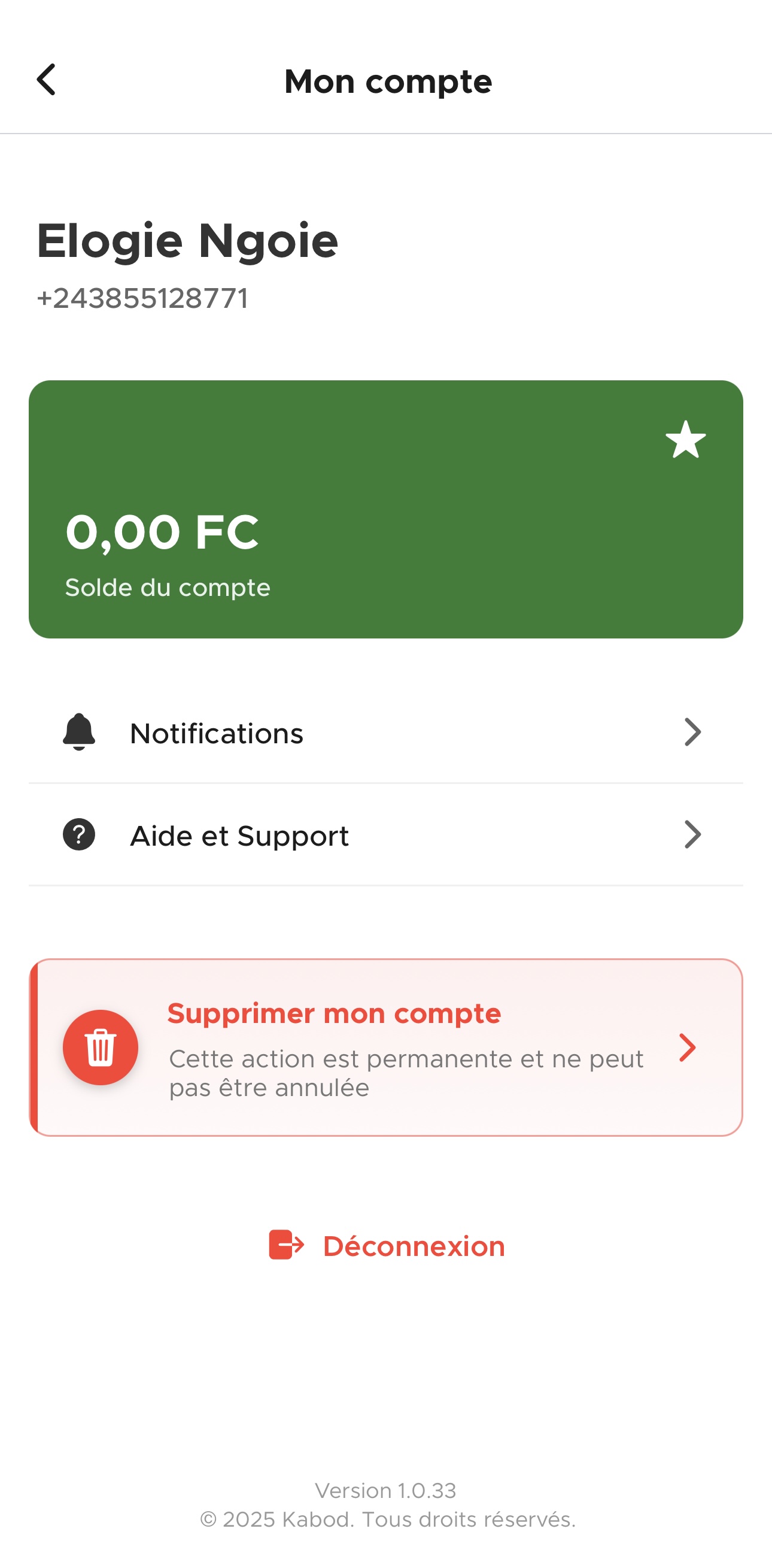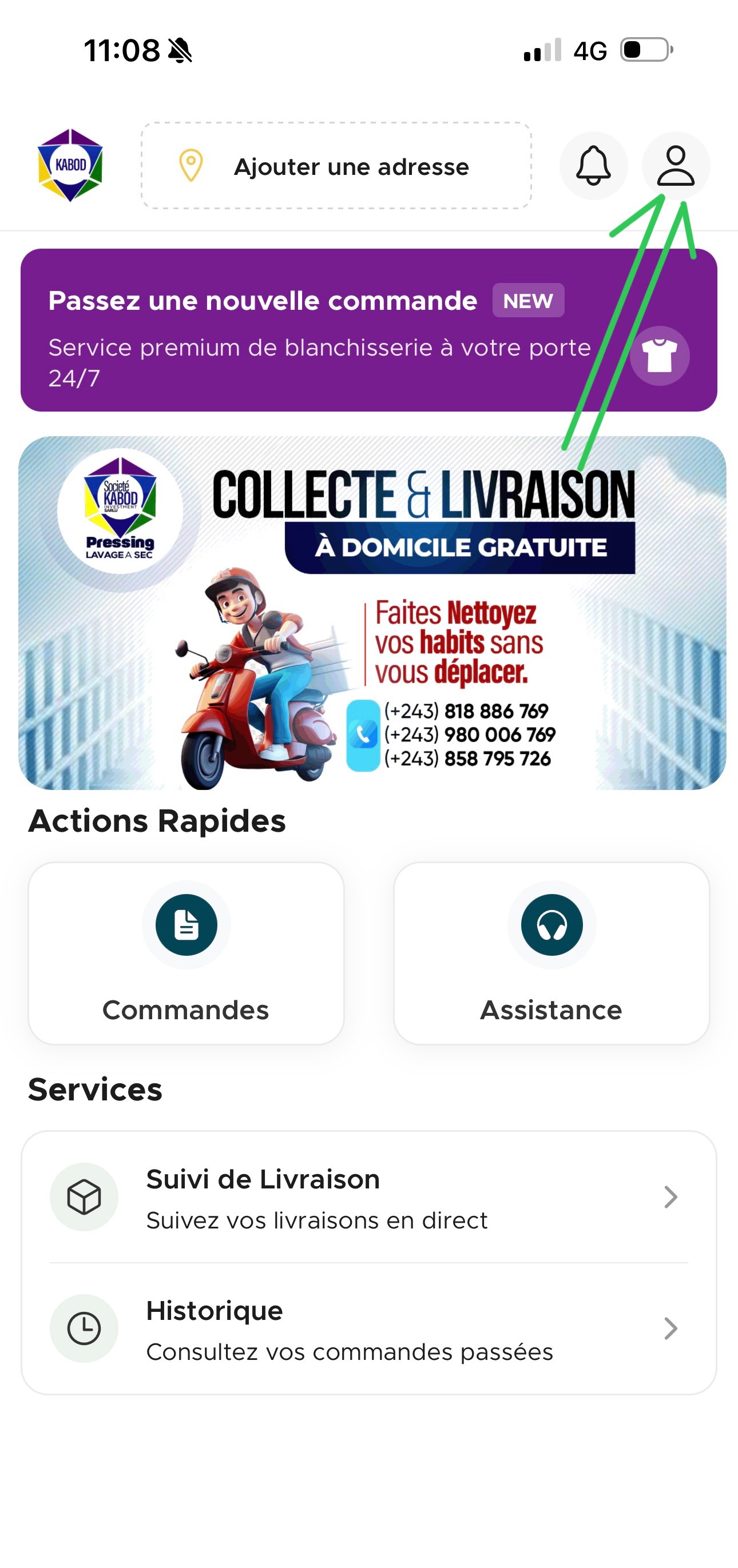 Login: Pour être en mesure de supprimer toutes les informations et données que vous avez dû entrer ou créer sur l'application mobile Kabod. Sur votre téléphone portable, localisez l'application mobile Kabod et connectez-vous comme d'habitude. Référez-vous à l'image ci-dessous.